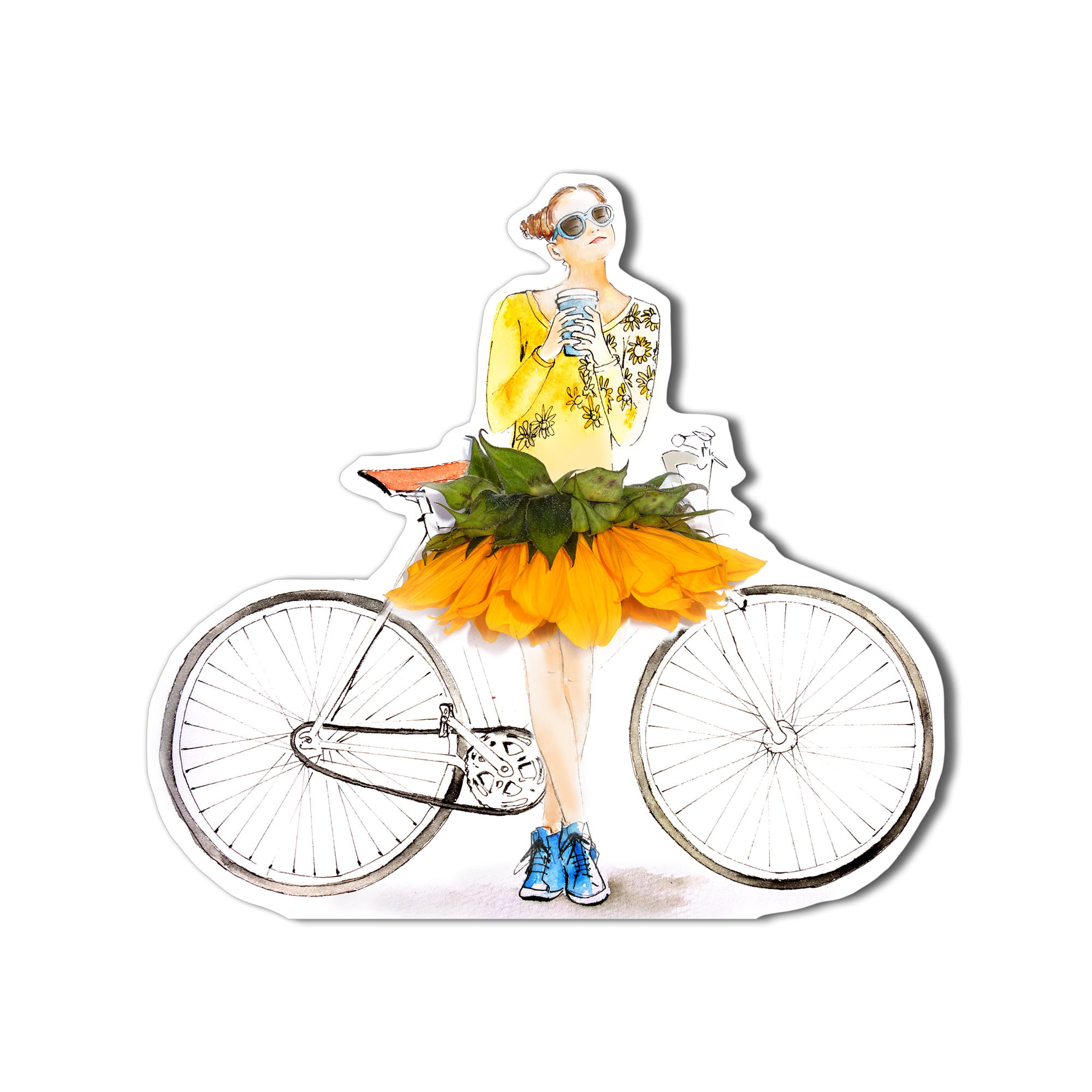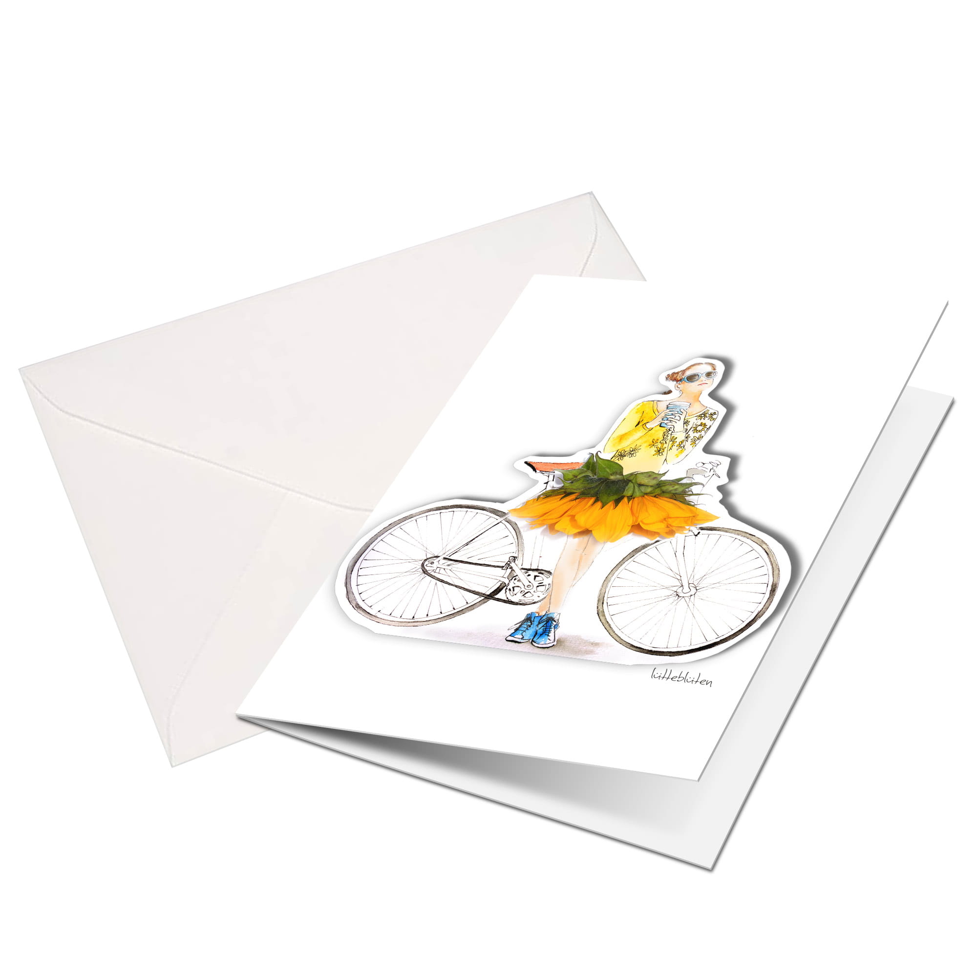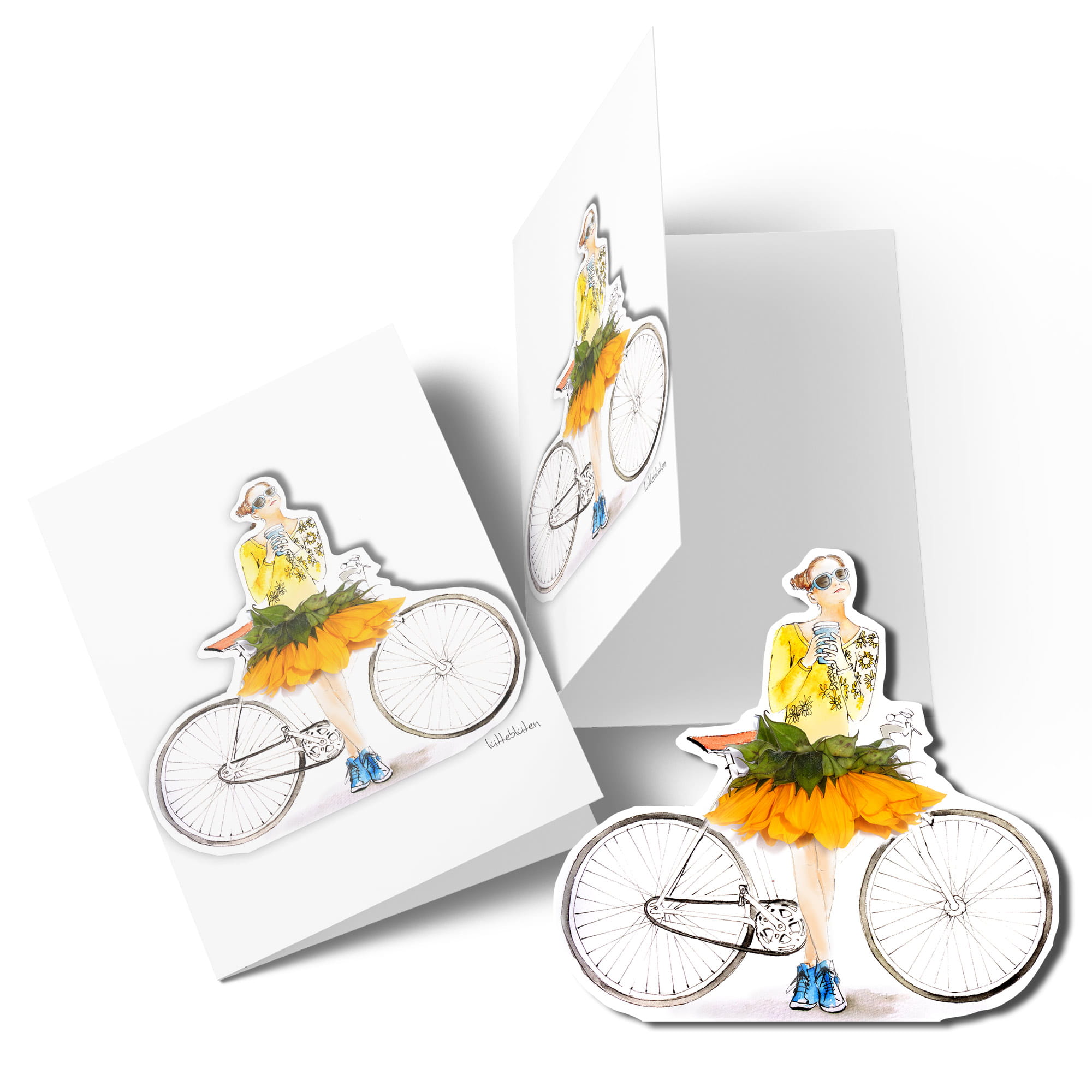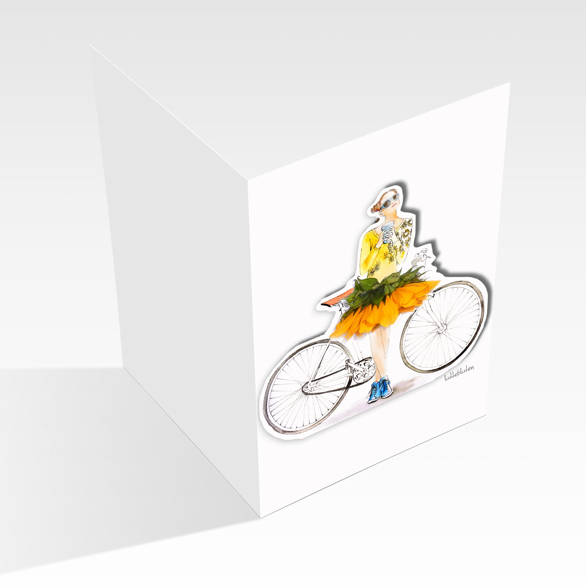 Diese fröhliche und stilvolle Klappkarte „Fahrradmädchen“ ist eine kleine Hommage an Sommer, Freiheit und Kreativität. Das Motiv zeigt eine entspannte Figur mit Eiskaffee, Sonnenbrille und einem leuchtenden Rock aus echten Blüten, die sie mit einem Fahrrad kombiniert – handgezeichnet und mit Liebe zum Detail gestaltet.