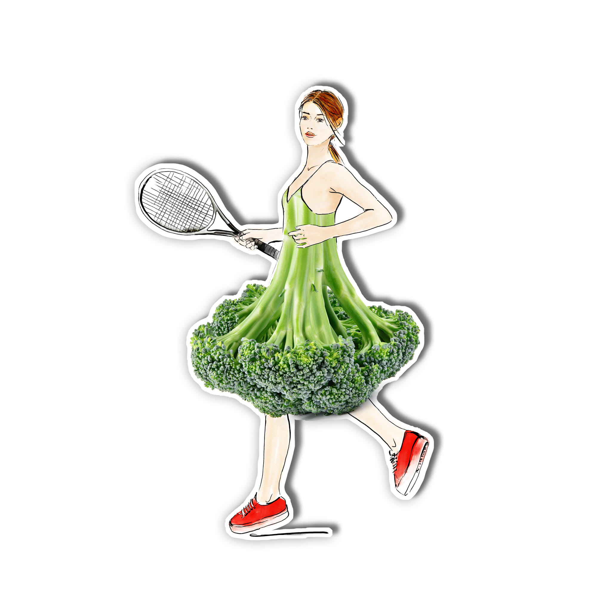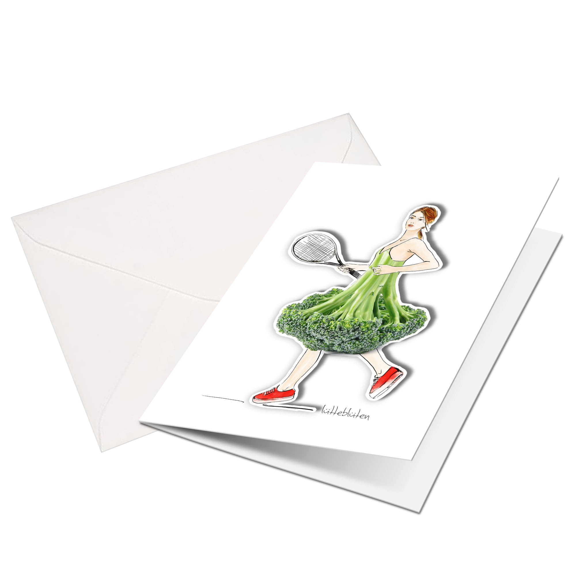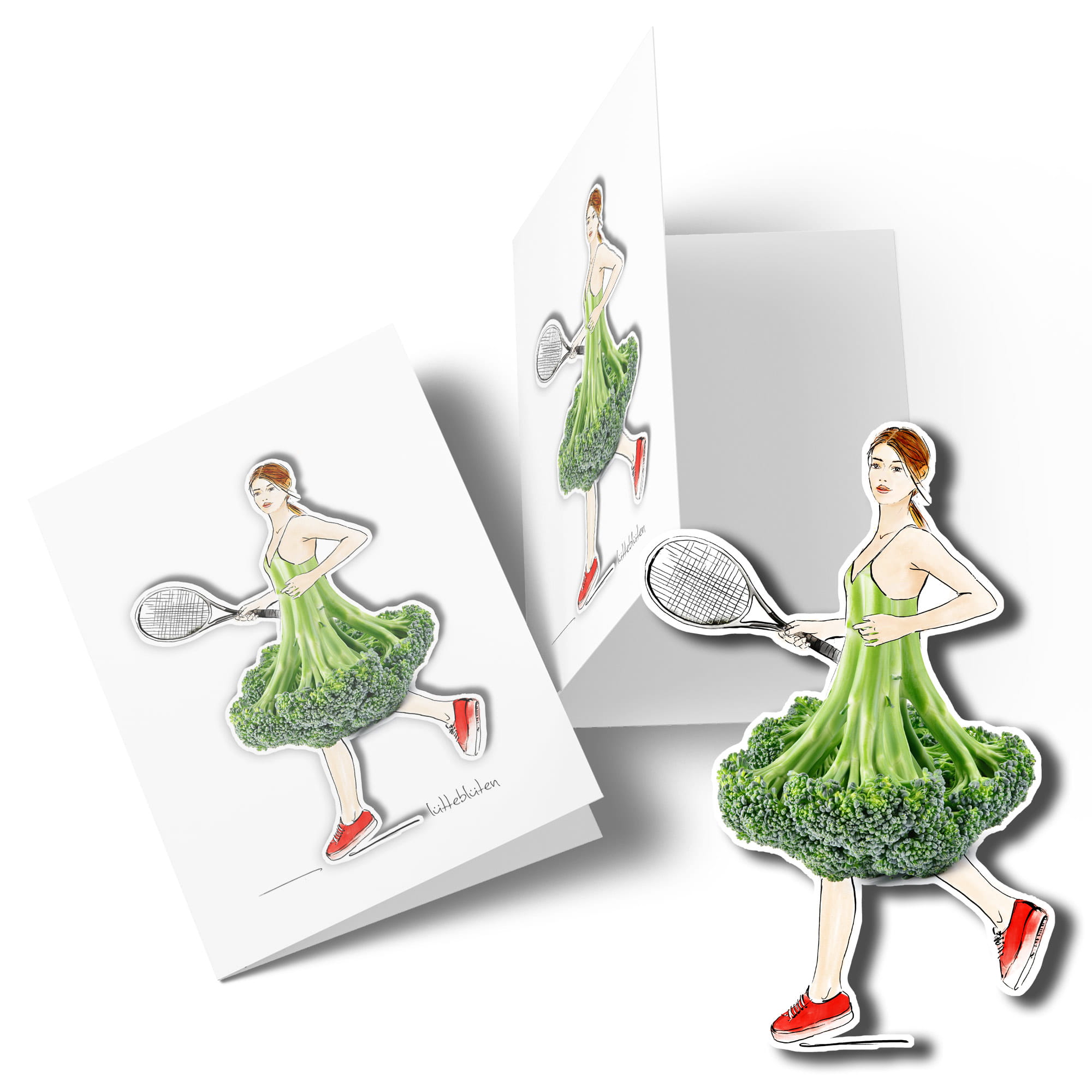 Die Klappkarte mit Magnet „Tennismatch“ bringt Bewegung, Witz und Stil in deine Grüße. Die originelle Illustration zeigt eine elegante Tennisspielerin mit einem Rock aus frischem Brokkoli – ein liebevoll gestaltetes Motiv mit Augenzwinkern.