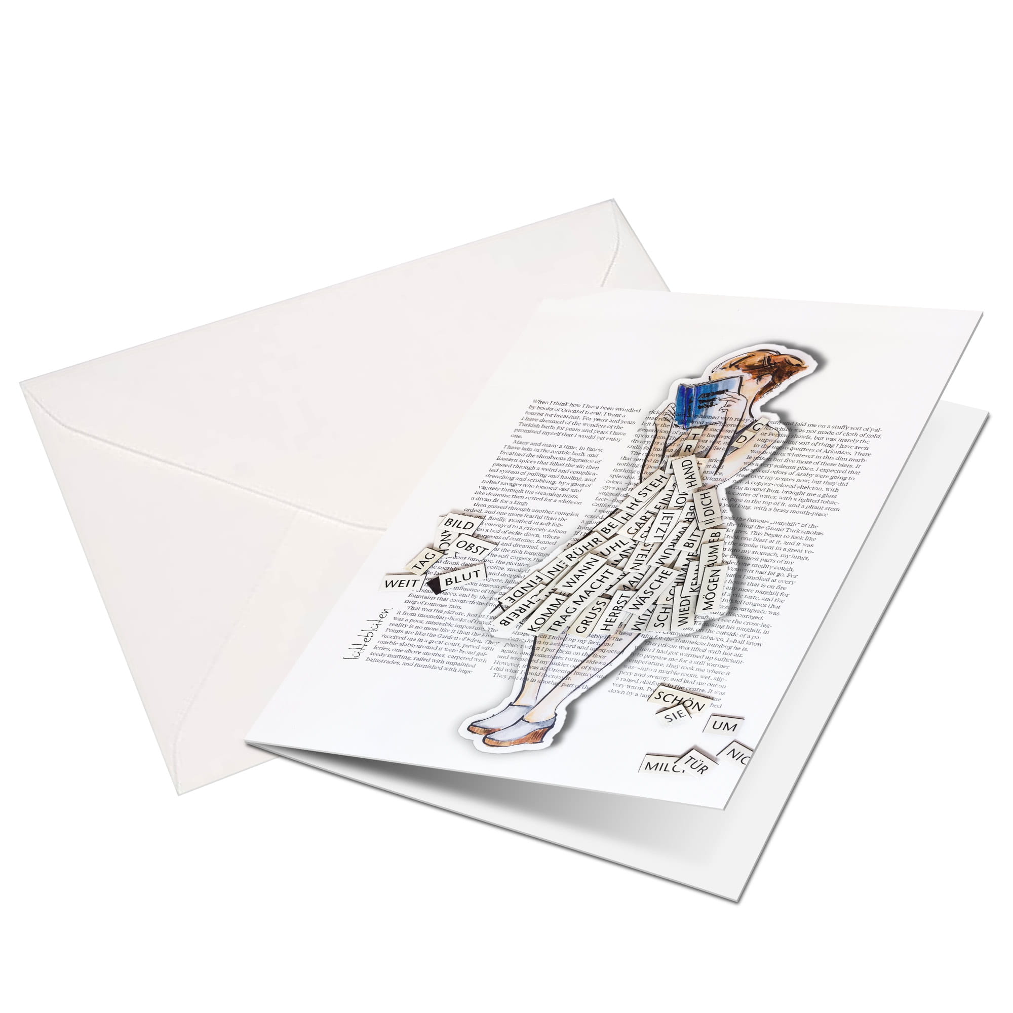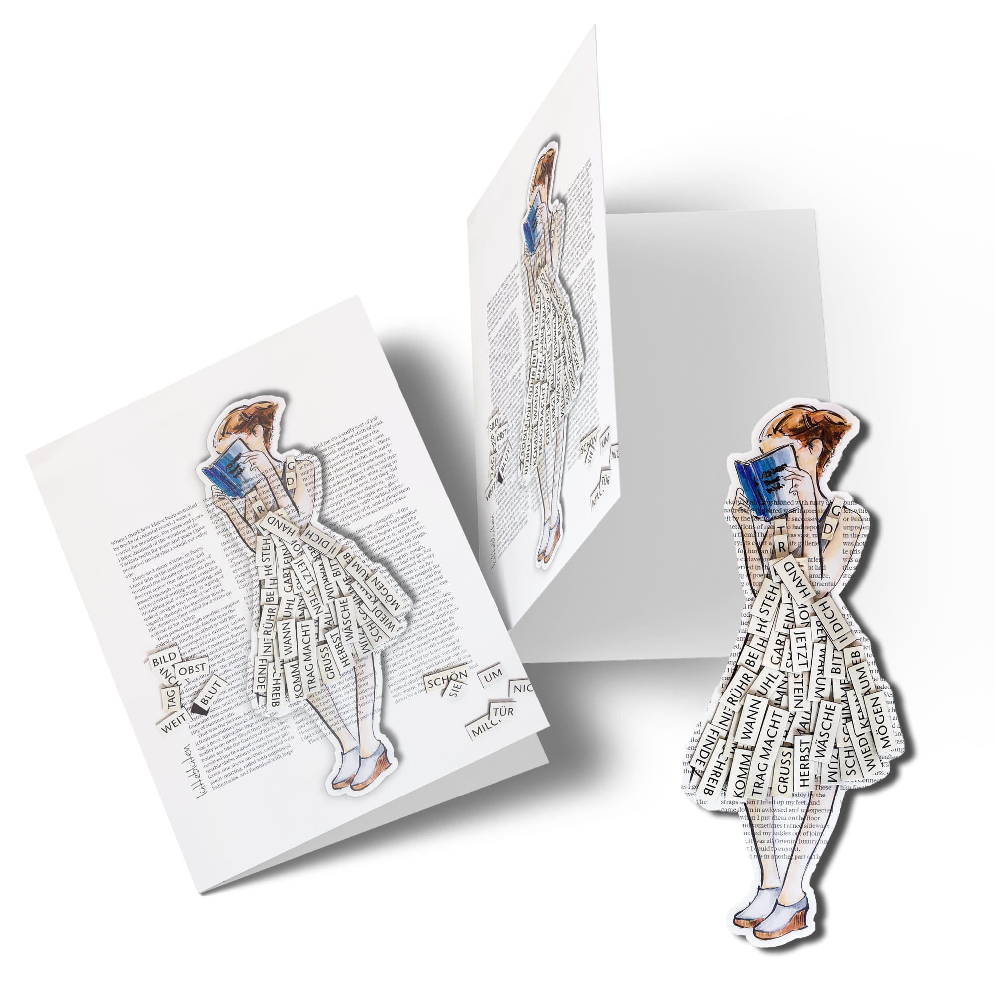 Für Bücherfreundinnen, Wortliebhaberinnen und kreative Köpfe: Die Klappkarte „Lesemaus“ ist eine Hommage an die Sprache und das Lesen. Der abnehmbare Magnet oder spülmaschinenfeste Sticker (124 x 50 mm) zeigt eine stilisierte Figur mit Kleid aus Wörtern und Ausschnitten – inspiriert von Literatur, Gedichten und Fantasie.
