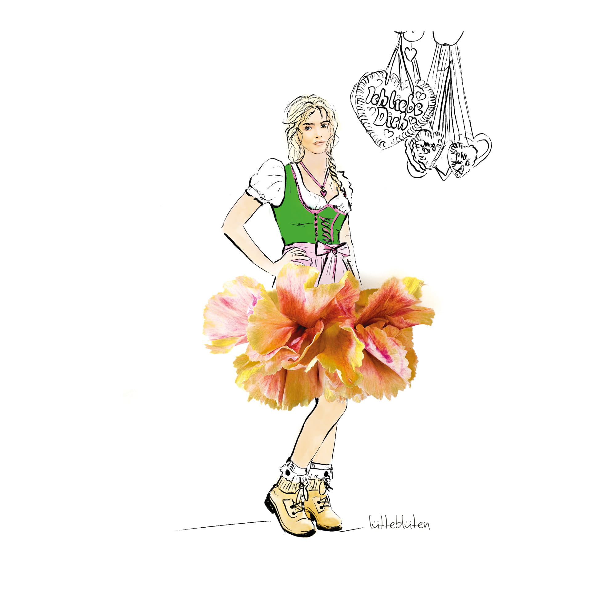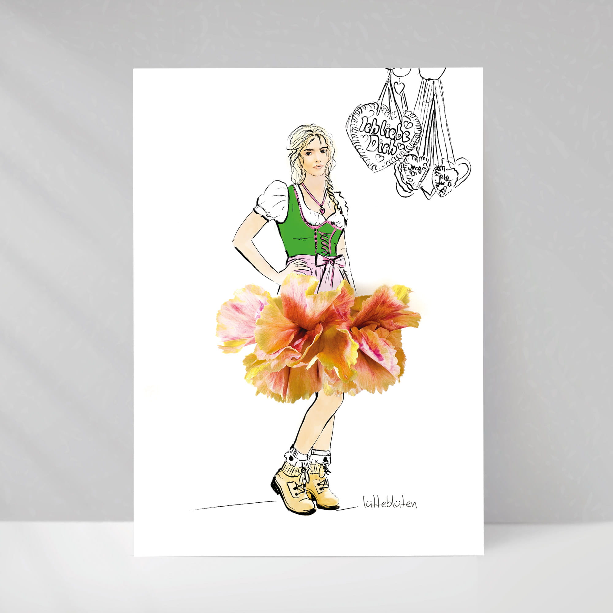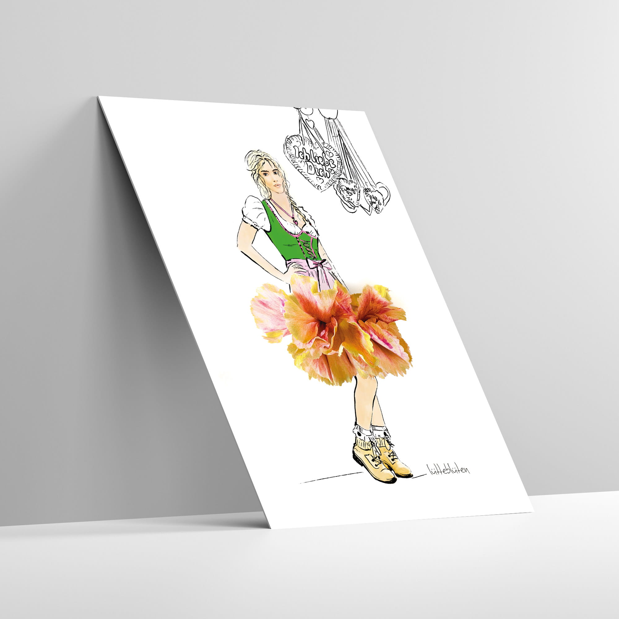 Ein kleiner Wiesn-Moment zum Mitnehmen. Dieses Mädchen im Blüten-Dirndl tanzt durch das Oktoberfest – leicht, fröhlich und ein bisschen frech. Ihr Rock aus echten Blüten schwingt wie eine kleine Papierwolke, und hinter ihr hängen Lebkuchenherzen in der warmen Herbstluft. Ein Motiv für alle, die Tracht lieben, Blumen sammeln und das Lachen der Wiesn einfangen möchten. Zart illustriert, mit echten Blüten arrangiert — ein Stück Münchner Lebensgefühl für Zuhause.