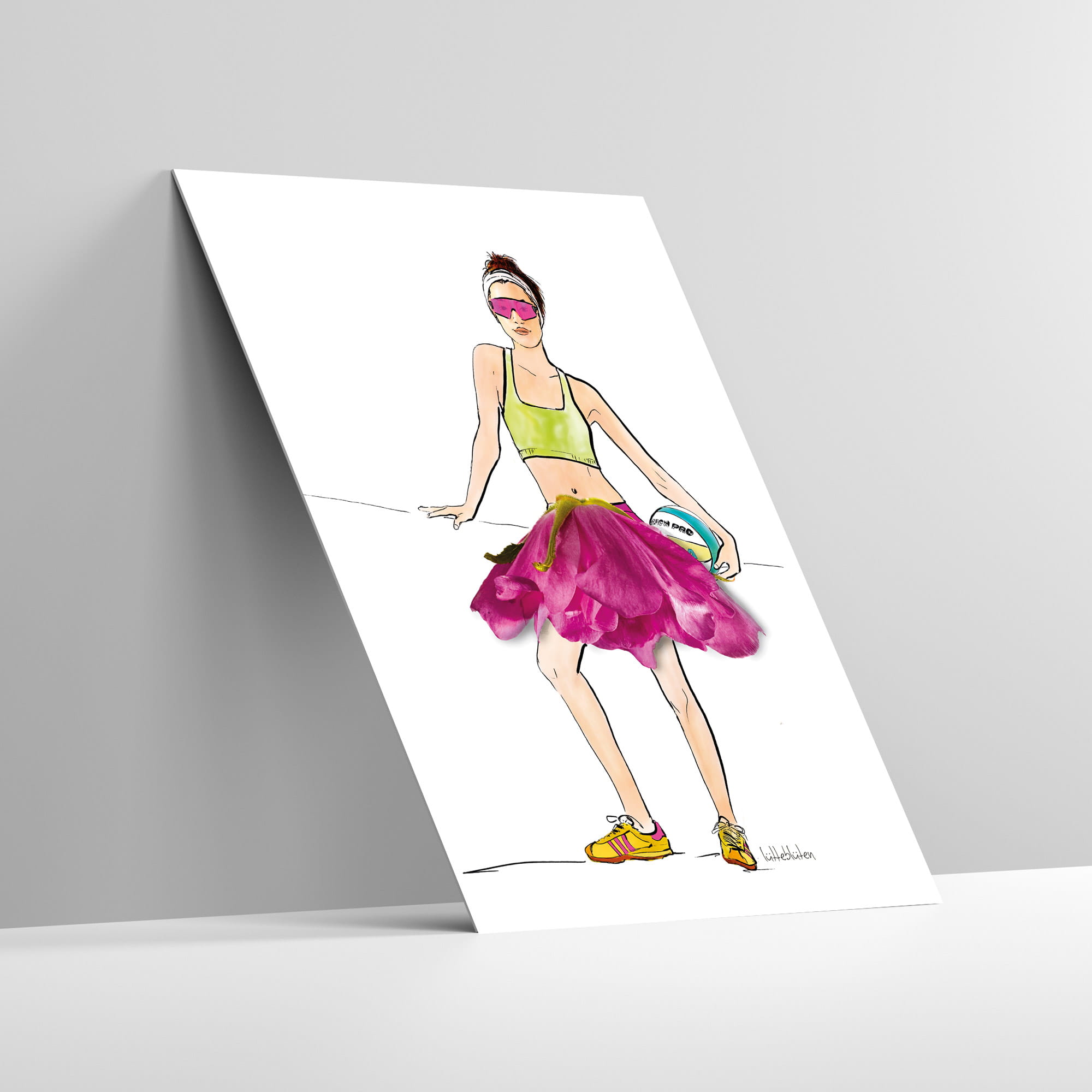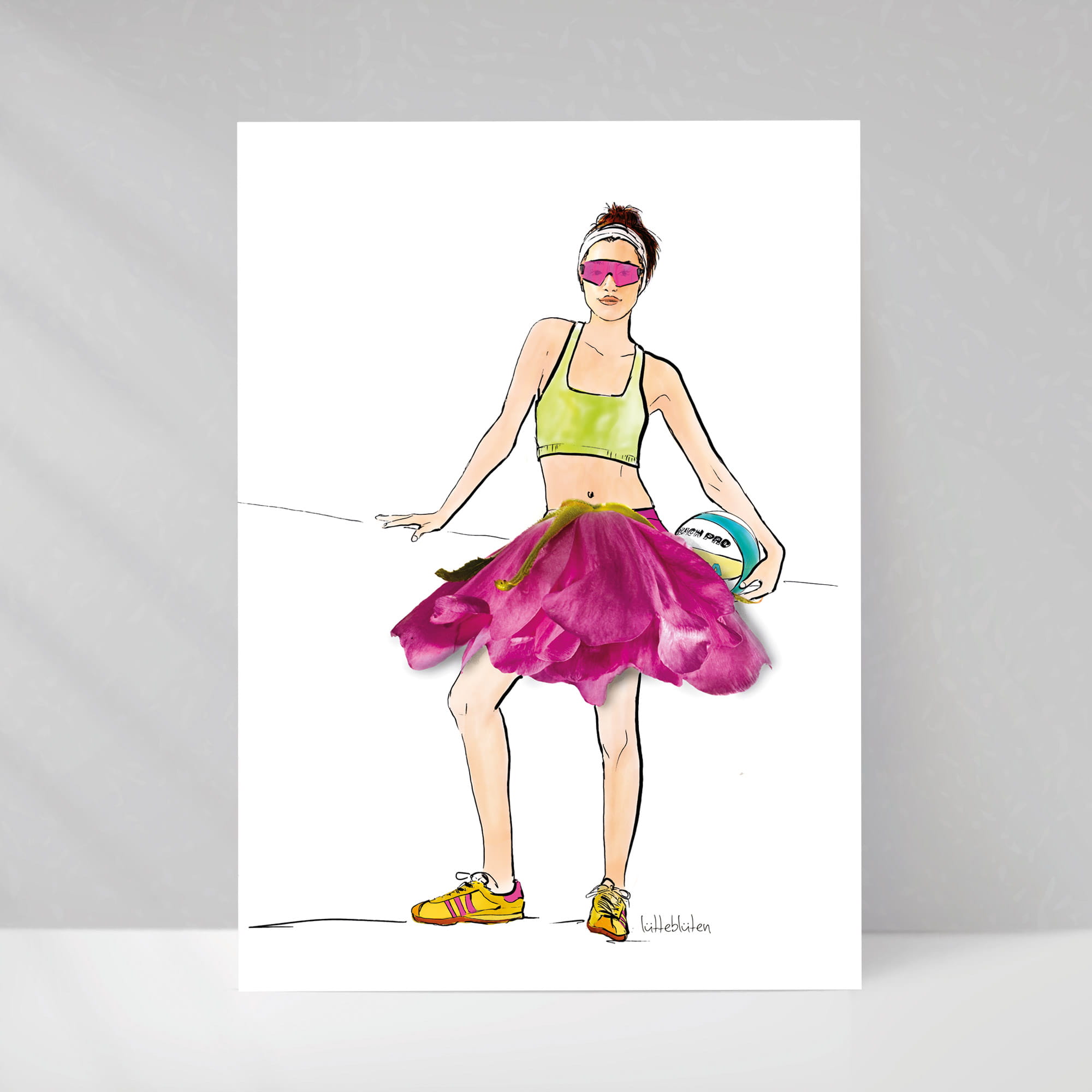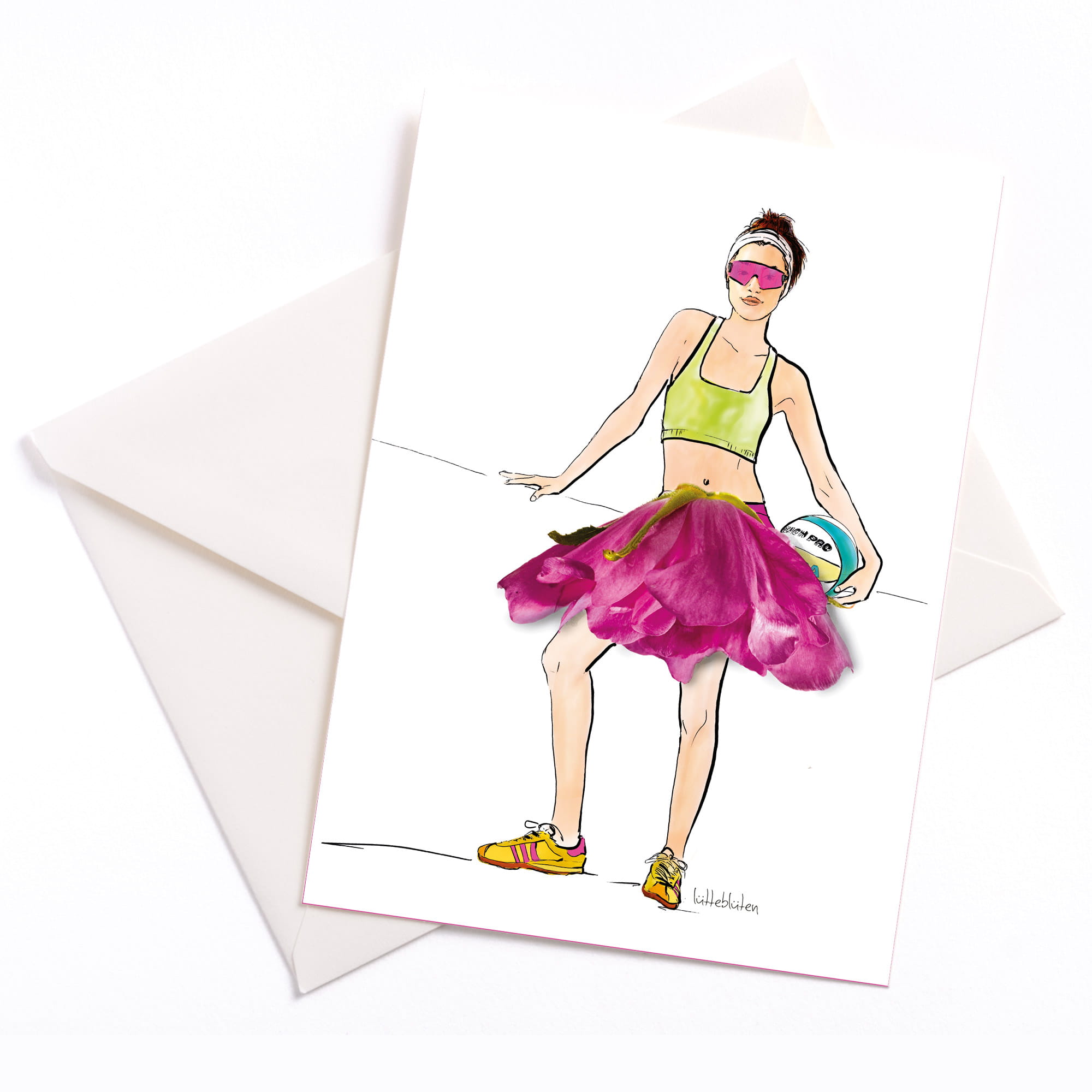 Barfuß im Sand, Sonne auf der Haut und ein Volleyballspiel am Strand – diese sommerliche Grußkarte „Beachvolleyball“ bringt echtes Urlaubsgefühl zu dir nach Hause. Das Motiv ist eine liebevoll gestaltete Collage aus Illustration und einer echten Sylterose, die anschließend fotografiert und hochwertig gedruckt wurde.