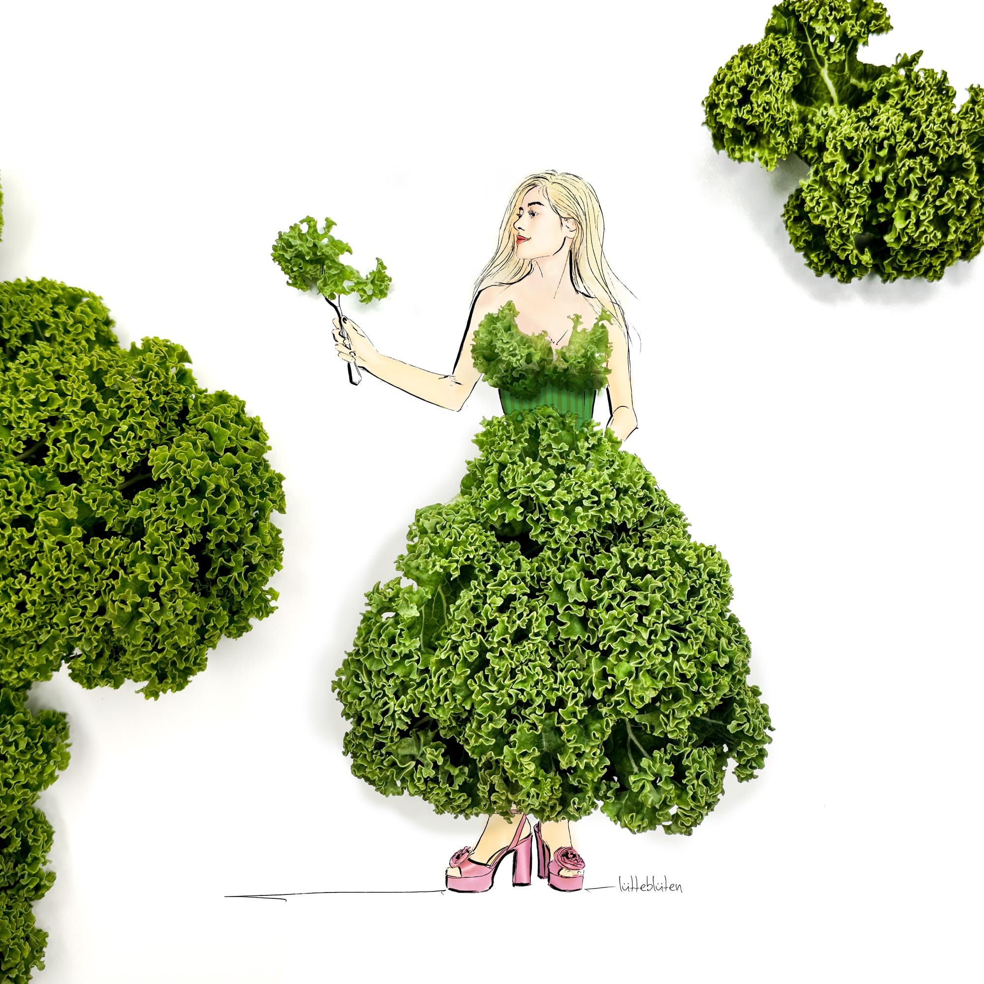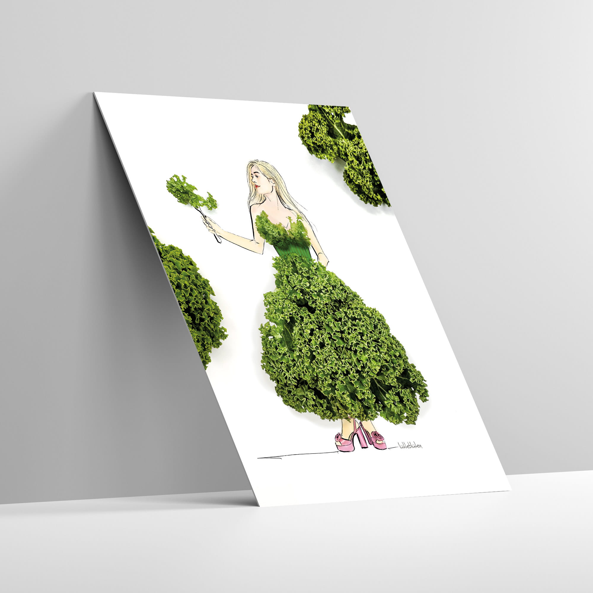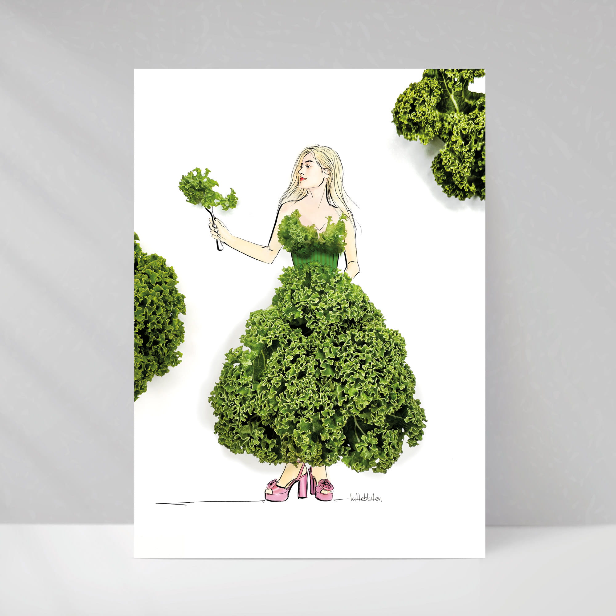 Who would have thought that kale could be so glamorous? With voluminous green and pink high heels, this lady strides confidently through the limelight. Her dress? No fabric, no tulle - but real, magnificently arranged kale leaves. The figure was lovingly illustrated and colored - and then actually "dressed" with fresh kale.