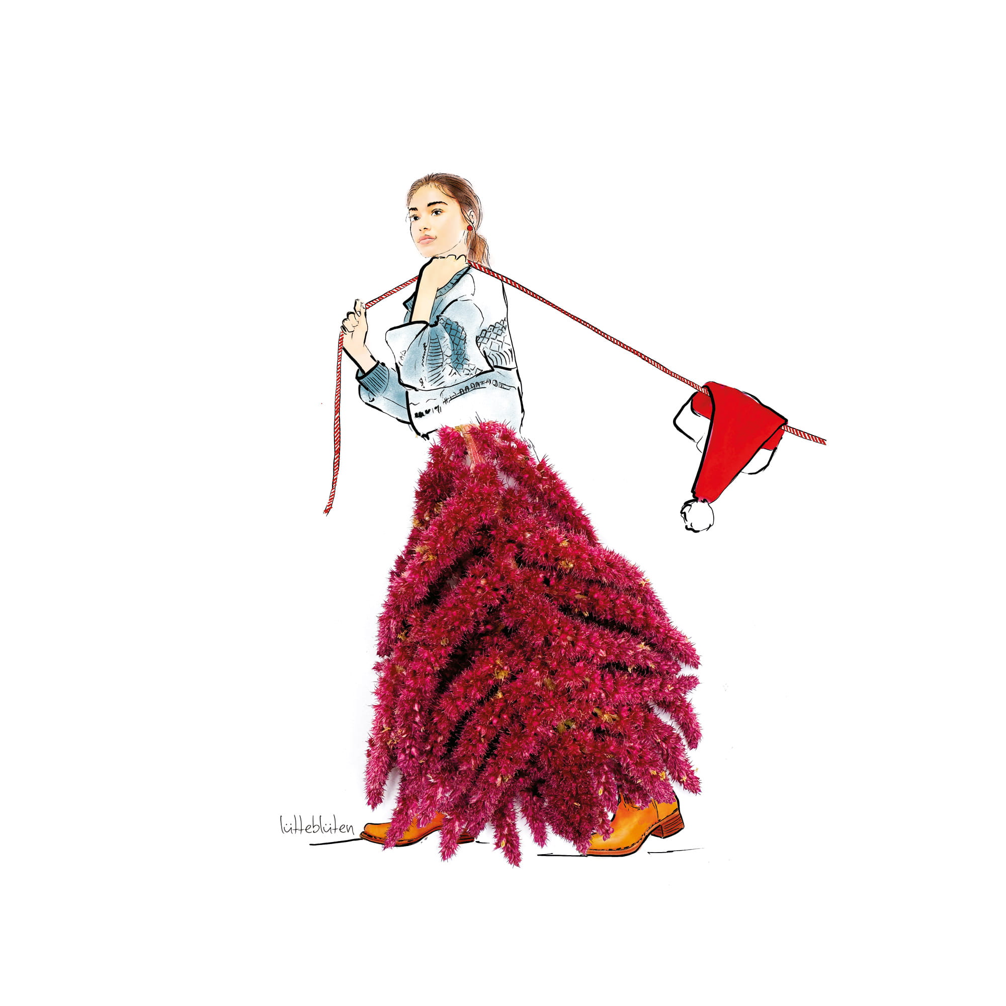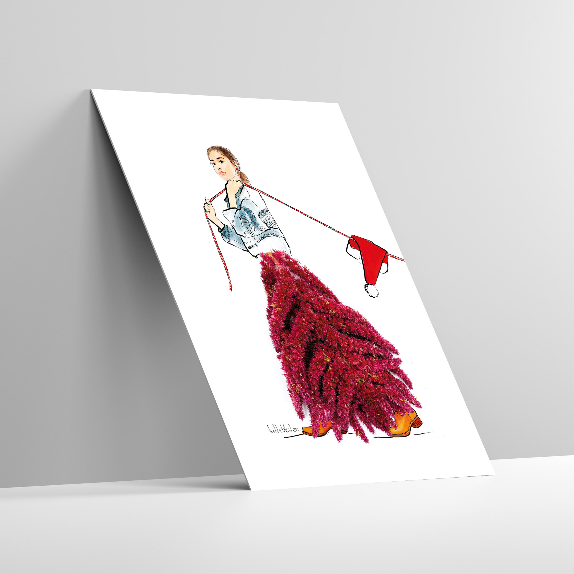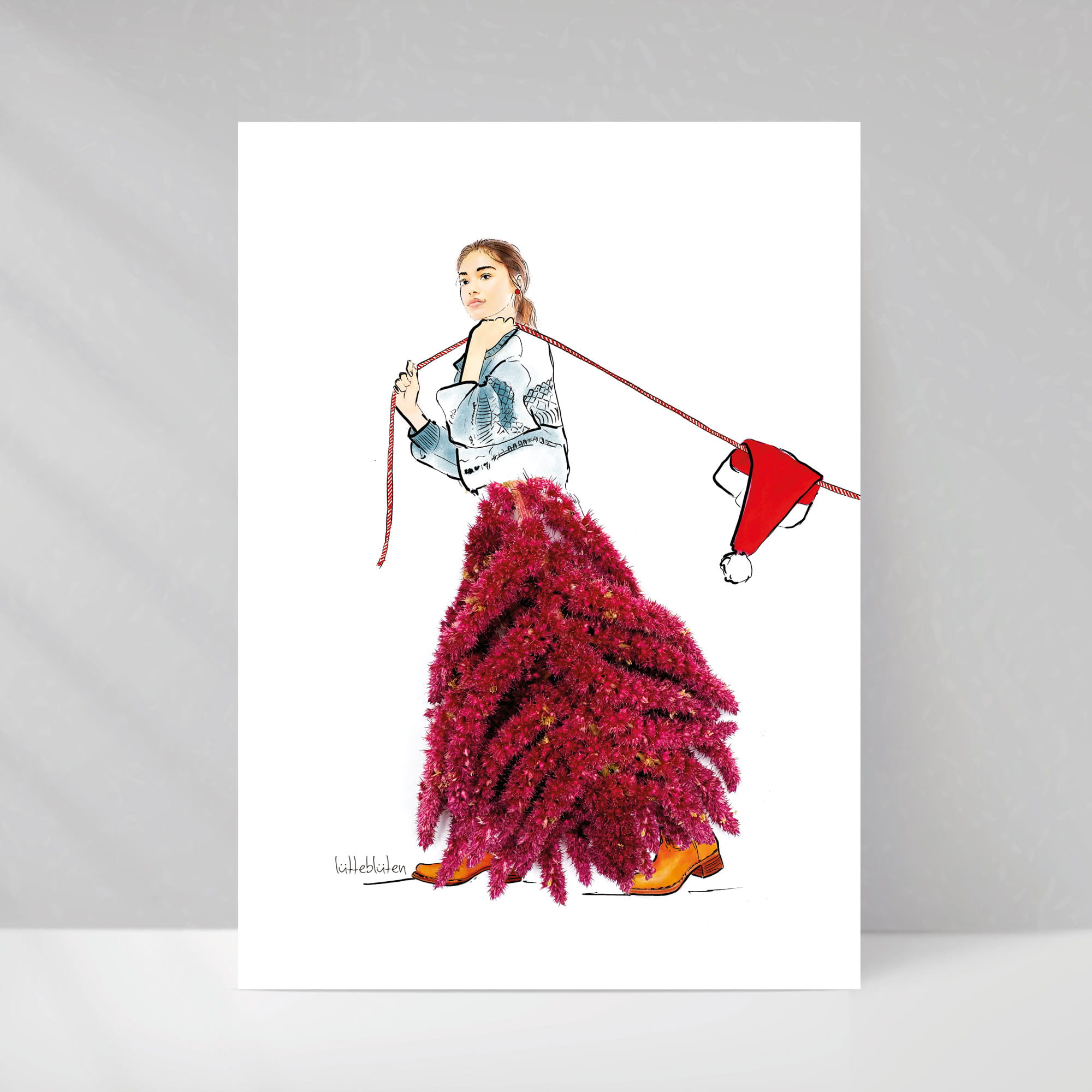 Eine junge Frau zieht selbstbewusst an einer roten Kordel – am anderen Ende baumelt eine vergessene Weihnachtsmütze. Die Figur wurde liebevoll illustriert, koloriert und anschließend mit echten Amaranthblüten bekleidet – direkt auf das Papier arrangiert und als fertige Collage fotografiert. So entsteht ein lebendiger 3D-Effekt, bei dem Illustration und Natur auf besondere Weise verschmelzen – überraschend, charmant und mit feinem Humor.